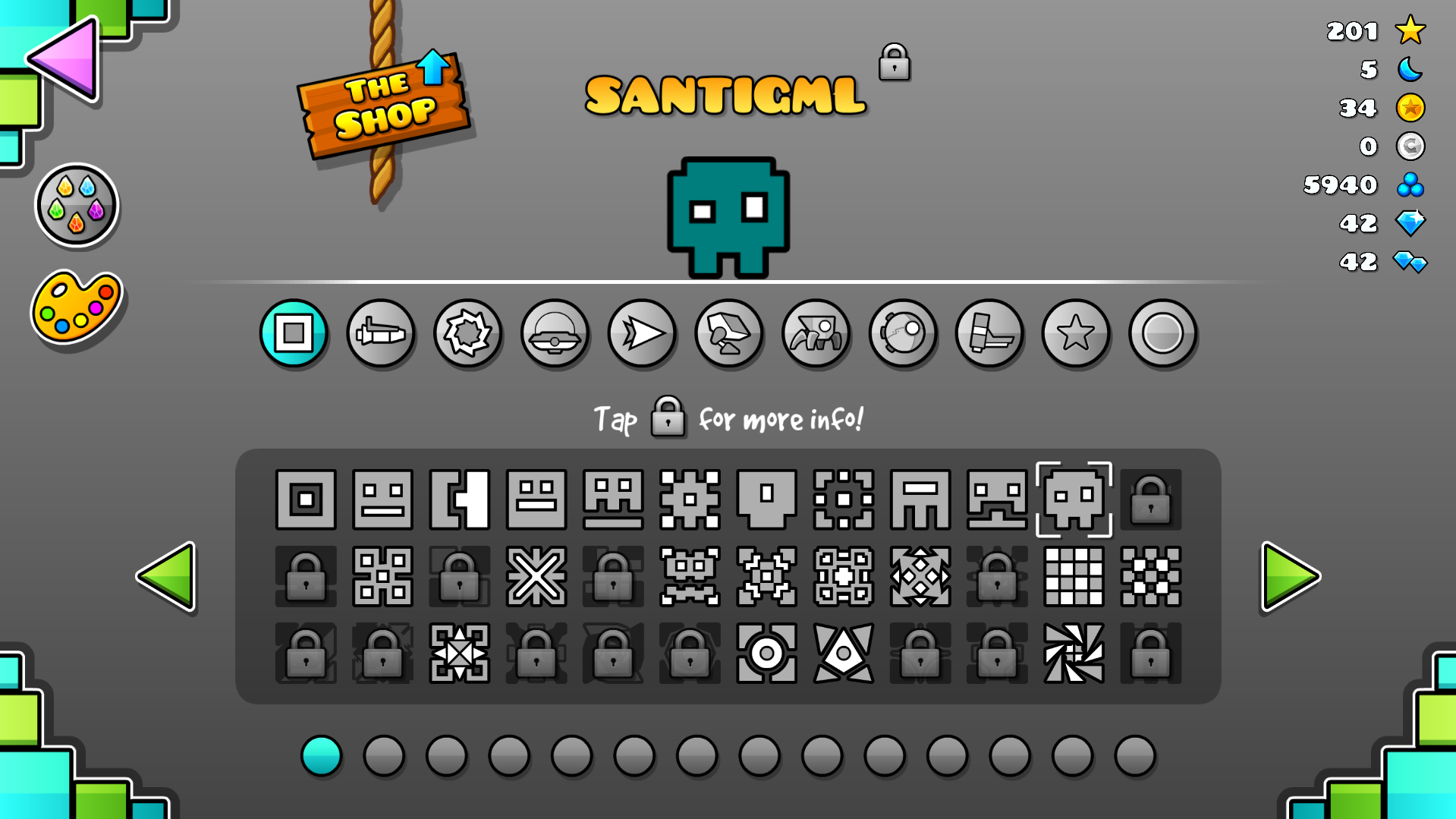 La gran gracia de este sistema es que muchas skins bastante usadas salen precisamente de aquí. Algunas por diseño, otras porque durante mucho tiempo fueron una de las mejores opciones accesibles, y otras porque se convirtieron en clásicos comunitarios. Las tiendas, además, son una parte importantísima del juego a nivel de búsqueda: muchísima gente entra a Google con términos como cómo abrir Secret Shop, qué comprar en Diamond Shop o mejores iconos de la tienda de Geometry Dash.