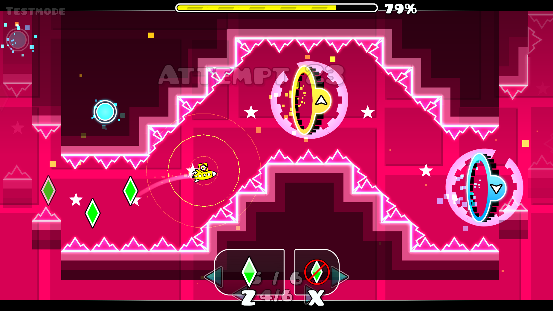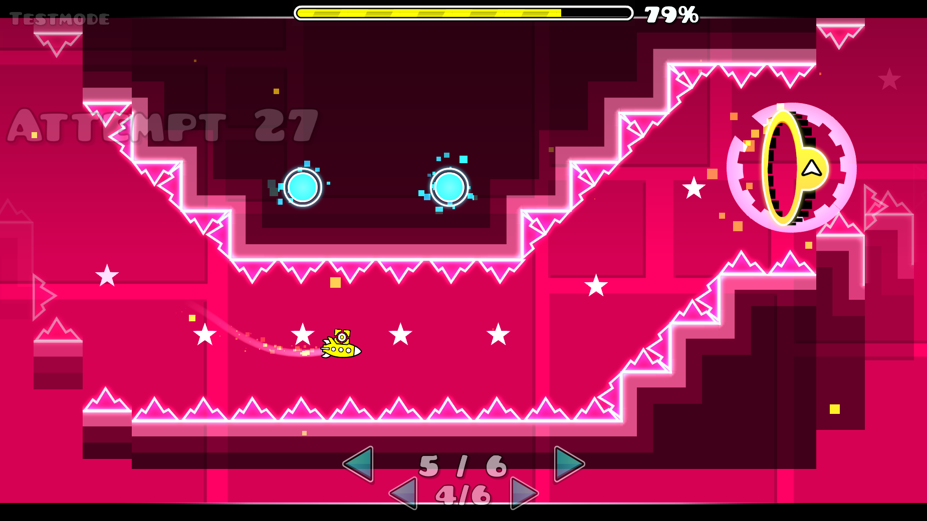 La diferencia real entre ambos sistemas está en la calidad del entrenamiento. El modo práctica sirve para aprender la ruta general del nivel, identificar portales, timings, transiciones y pulsaciones básicas. Es útil como primer contacto, pero tiene limitaciones claras cuando buscamos constancia. Los checkpoints pueden quedar en posiciones malas, a veces nos hacen reaparecer sin el ritmo correcto, y muchas secciones se sienten distintas a como se juegan de verdad en una run limpia. Eso provoca que un jugador “sepa” pasar una parte en práctica, pero falle una y otra vez cuando intenta ejecutarla en normal mode.