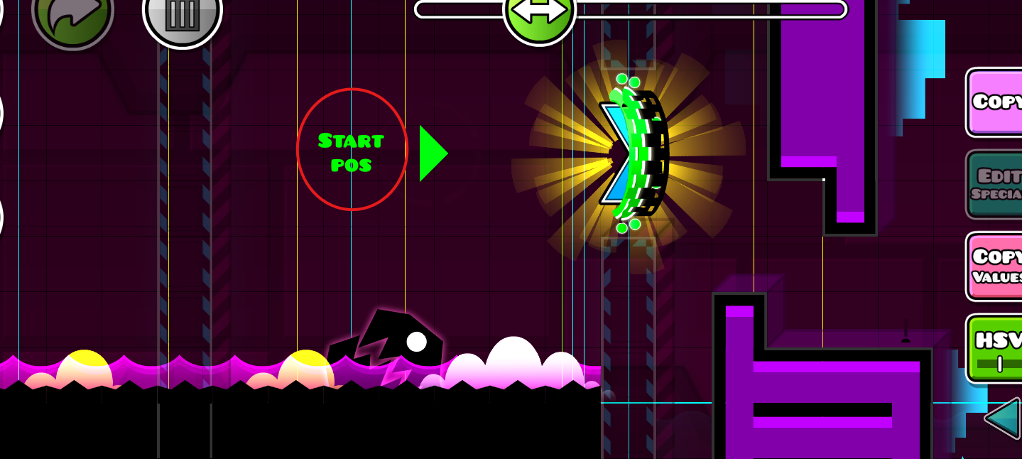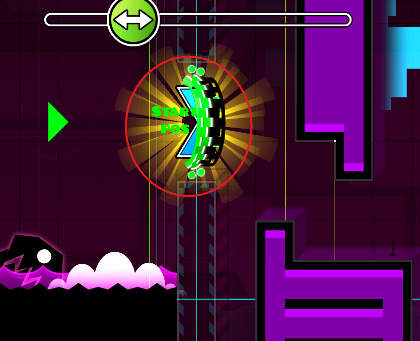 Una vez identificada la entrada correcta, insertamos la start pos en ese punto. Aquí lo más importante es comprobar que el icono aparezca con una transición natural y que el primer movimiento que hagamos se parezca al del nivel real. No queremos una práctica artificial. Queremos una sección que, al empezar desde ahí, siga sintiéndose como parte del nivel. Por eso, después de colocar la start pos, lo mejor es probarla varias veces seguidas y ver si la sensación coincide con lo que ocurre en una run normal.
