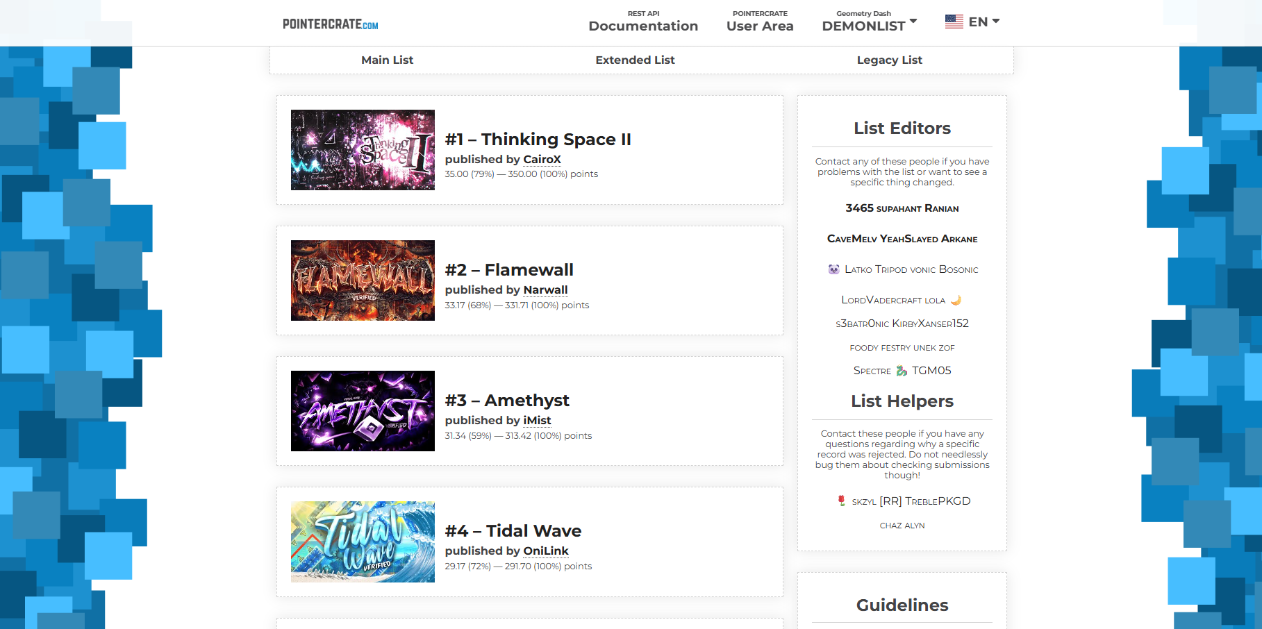 Cuando hoy se habla de la Demon List, Pointercrate es el nombre central. Su propia portada se presenta como la casa de la Demon List original y como el ranking más popular de los demons más difíciles de Geometry Dash. Además de mostrar la clasificación, Pointercrate mantiene guías, sistema de envío de records, stats viewer y un proceso de aceptación o rechazo manual de los records enviados.